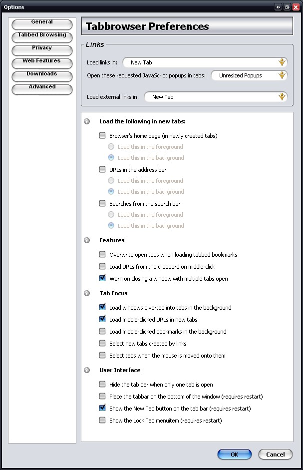 bangbang023 Veteran Posted June 15, 2005 Veteran Share Posted June 15, 2005 Well autoscroll solved first problem but I had to download the tab extension in order to get second one to work :(My Options menu is different form the one you showed there Hellbender, option icons are on the left side... Gday to you bangbang023 (Hope you are the same bang from OC forums :) 586067864[/snapback] oc forums? His options menu is different cause he is using the nightly trunk builds. To unlock those tab options, in the address bar, type in "about:config" without the quotes. In the screen that appears, right click, choose new and choose "boolean". For the preference name, enter browser.tabs.showSingleWindowModePrefs and for the value, set it to True. Now restart Firefox. Under advanced options, you should have a whole bunch of tabbed browsing options. This value may already exist for you, so search for it first. If it does exist, simply set it to true and restart. Link to comment Share on other sites More sharing options...
