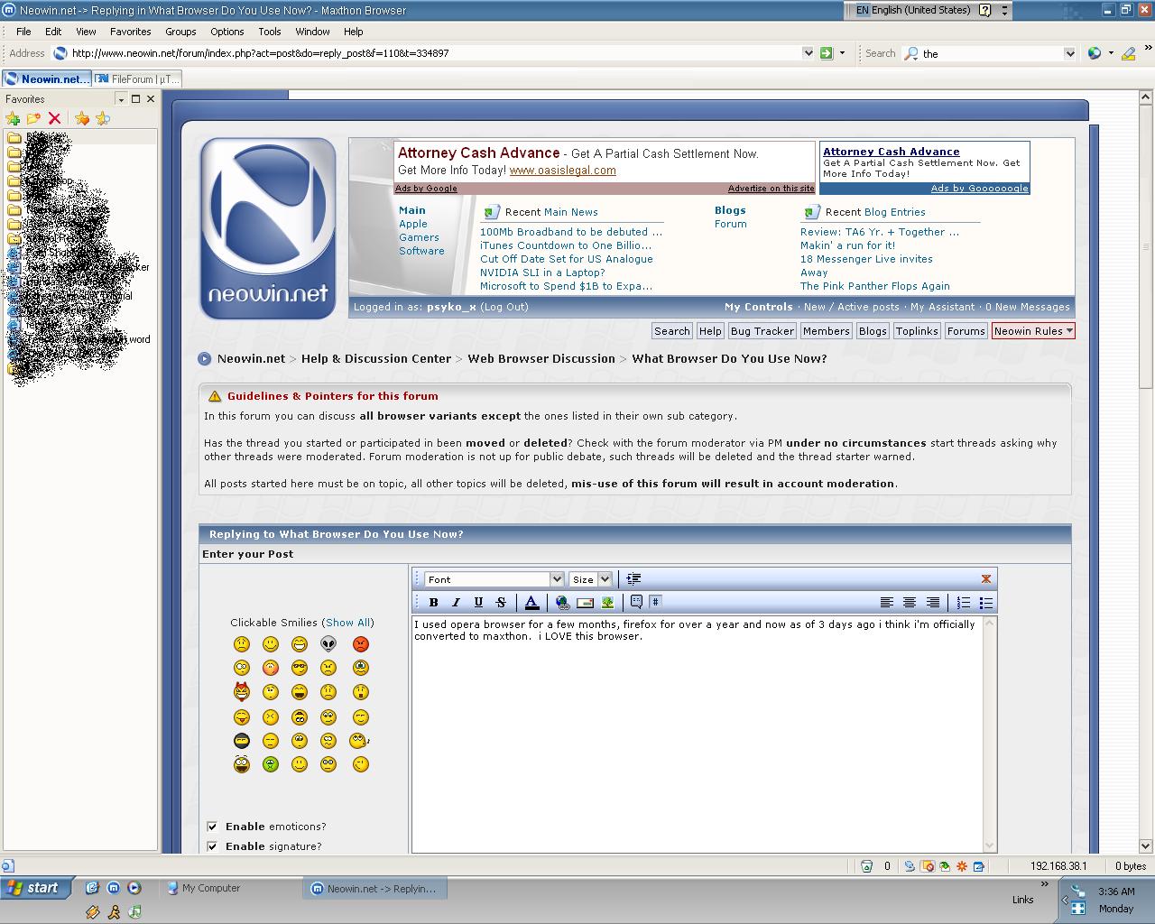psyko_x Posted February 13, 2006 Share Posted February 13, 2006 (edited) I used opera browser for a few months, firefox for over a year and now as of 3 days ago i think i'm officially converted to maxthon. i LOVE this browser. tiny harddisk and memory usage, very clean, and most importantly, rock stable. i'm assuming most of you have heard of it but heres a screenshot just in case firefox (1.5.0.1) was really getting on my nerves. it was crashing on freezing up on pages with embedded video or the process would still be running after i closed the program etc. anyways... theres no compatibility problems on maxthon since it run on the IE engine. theres mouse gestures built in which is pretty much the only firefox extension i used. memory usage with one tab is 8.2MB as opposed to firefox's 22MB. check out maxthon if you haven't yet Edited February 13, 2006 by psyko_x Link to comment Share on other sites More sharing options...