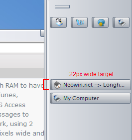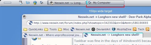 zhangm Supervisor Posted July 10, 2005 Supervisor Share Posted July 10, 2005 Right click taskbar -> uncheck "lock the taskbar",Drag taskbar to left or right of screen, resize to taste :p Right click taskbar -> check "lock the taskbar" instantly more space for open programs 586191712[/snapback] The problem with your "quick fix" is that it isn't one. You flick your cursor either to the top or bottom of the screen, and under ideal conditions, you get a wide target to hit. In the screenshot, I have 150px of button to click on. If you have your taskbar on the side, a la Sidebar, when you flick your mouse over to the left or right side, you're presented with a 22px wide target to hit. While we're at it, we might as well shrink the captionbar buttons to 6x6 pixels and turn your desktop into the equivalent of a shooting range. Also, Windows organizes the taskbar buttons by chronological order (and then by parent program). We interpret chronological order more easily in horizontal format. When's the last time you saw a vertically oriented timeline? The point is, your mind has an easier time connecting where a window is on the taskbar, based on when it was opened if its horizontally oriented, rather than if it were vertically oriented. I agree that OSX has definitely one-upped (more like twenty-upped) Microsoft in usability. The OSX dock always maintains some visual cue as to which window is which, and it never shrinks the text description that identifies each window. You never see "Sa..." when you hover over a dock icon, unless that's what the damn window is named. Minimize in place, along with Expose, definitely help. Microsoft has had this basic function in its OS for years. Try Winkey + D, or Winkey + M, and ALT + Tab. They just got lazy, figured the taskbar was enough, and quit innovating their features. Incredibly stupid move on their part. Now they're behind the times as far as organizing all the information that we deal with today. Link to comment Share on other sites More sharing options...