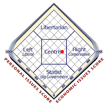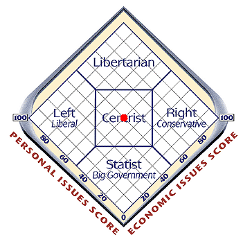rbet Posted July 10, 2005 Share Posted July 10, 2005 Sorry if posted before. World's Smallest Political Quiz I'm a CENTRIST... CENTRISTS espouse a "middle ground" regarding government control of the economy and personal behavior. Depending on the issue, they sometimes favor government intervention and sometimes support individual freedom of choice. Centrists pride themselves on keeping an open mind, tend to oppose "political extremes," and emphasize what they describe as "practical" solutions to problems. Link to comment Share on other sites More sharing options...
