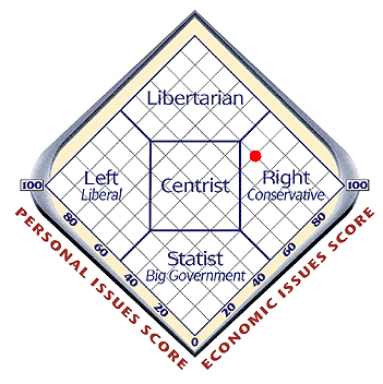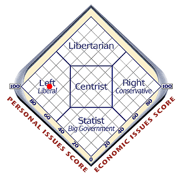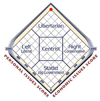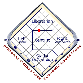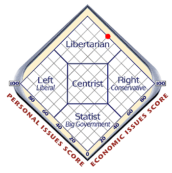 xplatinum Posted July 10, 2005 Share Posted July 10, 2005 LIBERTARIAN Your PERSONAL issues Score is 90%. Your ECONOMIC issues Score is 70%. LIBERTARIANS support maximum liberty in both personal and economic matters. They advocate a much smaller government; one that is limited to protecting individuals from coercion and violence. Libertarians tend to embrace individual responsibility, oppose government bureaucracy and taxes, promote private charity, tolerate diverse lifestyles, support the free market, and defend civil liberties. http://www.theadvocates.org/quiz-score/draw.php?p=9&e=7 Link to comment Share on other sites More sharing options...