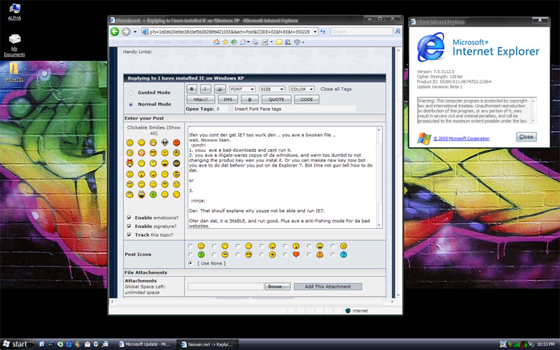 trek Posted July 28, 2005 Share Posted July 28, 2005 can you speak english and repost (or edit) so we can understand you? 586284567[/snapback] I don't know why he'd spend the effort making his post 1337.. it's much easier typing regular english... rofl. I have way too much time on my hands... I should be sleeping... but as best as I could discern, this is what he said: Okay, Okay, listen to me now. Err...If you can't get IE7 to work then you have a broken file. There are a few reasons for this: 1. Your IE7 setup file is corrupt. 2. You have an illegal copy of Windows, and were too dumb to change the product key when you installed it. Or you can make a new key now, but you have to do that before you install Internet Explorer 7. But I am not going to tell you how to do that. or 3. :ph3ar: There. That should explain why you are not able to run IE7. Other than that, it's Stable. Plus you have anti-phishing mode for bad websites. Good, Fast, but still has a little buggy interface On a scale of 1 to 10, I give IE7 a J. I still run it. It is nice. Link to comment Share on other sites More sharing options...