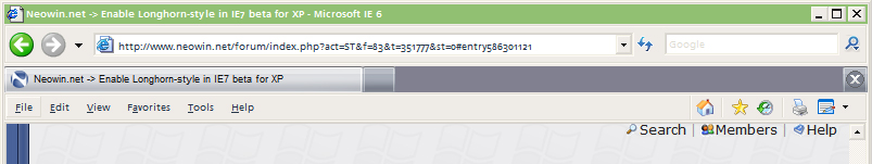 Sticktron Posted July 31, 2005 Share Posted July 31, 2005 (edited) I was tinkering with the IE7 beta, and managed to turn ON the built-in Longhorn style, complete with shiny new resources. Now your tabs can look nicer than FF! -- How To: Open \windows\system32\ieframe.dll in a resource editor. Edit UIFILE\20481. The first chunk of XML, the element block, contains an attribute called sheet. Change this value from StyleXP to StyleLH. Save the file, and replace in your dllcache and system32 directories. :ninja: Edited July 31, 2005 by Sticktron Link to comment Share on other sites More sharing options...