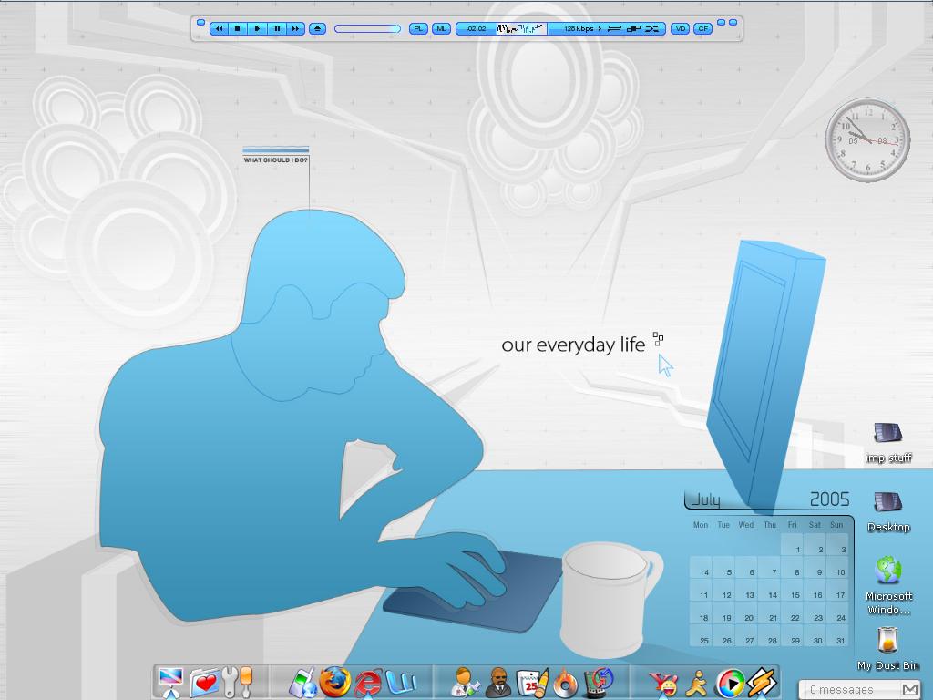 easternBrain Posted August 13, 2005 Share Posted August 13, 2005 (edited) My Wall changes every week or soon therefore here's the second already Rest everything remains same :cool: Theme: OSX Tiger (Taskbar hidden) Wallpaper: icube001_Everyday_BLue (dont remember where i got that) :again: :( DOCK: Object bar Icon set: a mix of over 20 icon sets Clock: elprime Calender: rainlender industria mix2 Edited August 13, 2005 by easternBrain Link to comment Share on other sites More sharing options...