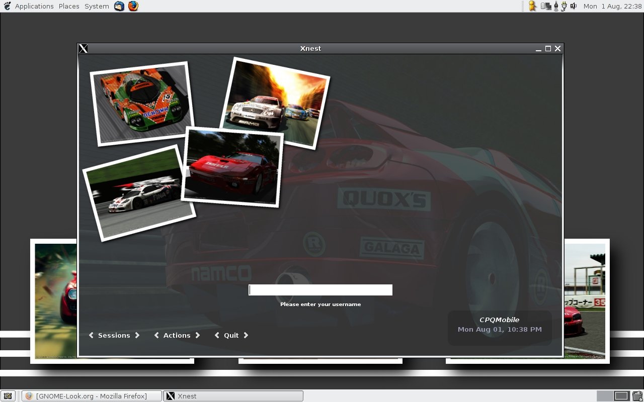 markwolfe Veteran Posted August 2, 2005 Veteran Share Posted August 2, 2005 I posted my work in the General one and completly forget to post it in here, shame on me :blush: :rofl: Visual style/Icons set: Graphite Suite Wallpaper: Escape/Crash/Speed by me but using resized wallpapers from Gamewallpapers.com Below, you'll also find a custom GDM I made to match my desktop. 586310657[/snapback] Oooh, hey! I was just looking into gdm and customizing my login, after using the system default for... well, since I have ever used Linux.Nice to see that gdmXnest can test these out in a new window, instead of logging out and in all the time. I like the matching theme idea (Y) too bad I have a selection of about 6 walls that are randomly selected on boot... Perhaps I can use some scaled down versions of each wall, and set them up like photos on my gdm background, similar to what you have done... Hmmmm... ideas. :) Link to comment Share on other sites More sharing options...