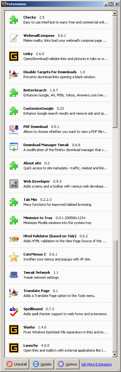 inVision Posted August 2, 2005 Author Share Posted August 2, 2005 What extensions do you have installed? I believe the problem may lie in one of them. 586314794[/snapback] Here's the list... Link to comment Share on other sites More sharing options...