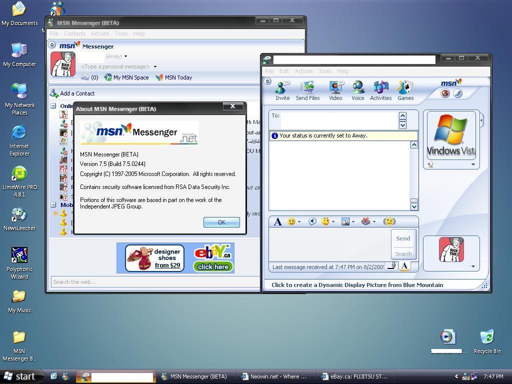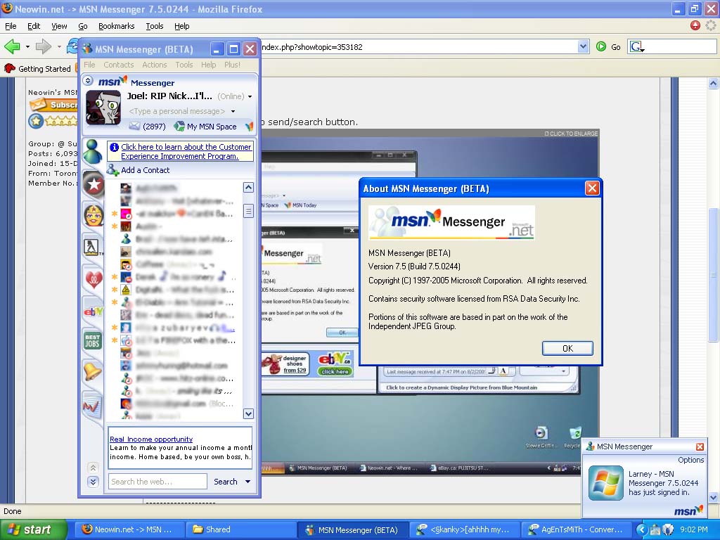 Andrew Lyle Global Moderator Posted August 3, 2005 Global Moderator Share Posted August 3, 2005 apatch version is out...anyone else having this new msn version create a file on the desktop with each run? 586316957[/snapback] you are probably looking at the BETA information window? if you open Help > About MSN Messenger 7.5 BETA, it says on the last line: double click the shortcut to the MSN Messenger Home Page (....) located on your desktop and clicking the download button. lylesback2 where did you get that theme? that the vista theme but the icons are not vista so iguess is just a theme for xp where did you get it ? 586316789[/snapback] it's actually ME in the screen shot.. and Gamedtx taking it. we have each other on MSN.. but we are actually both using the same theme. Gamedtx actually sent it to me too.. LOL, but it's called "Longhorn5203VS_v1_4.zip" not exactly sure of the real name. PM Gamedtx for it Link to comment Share on other sites More sharing options...