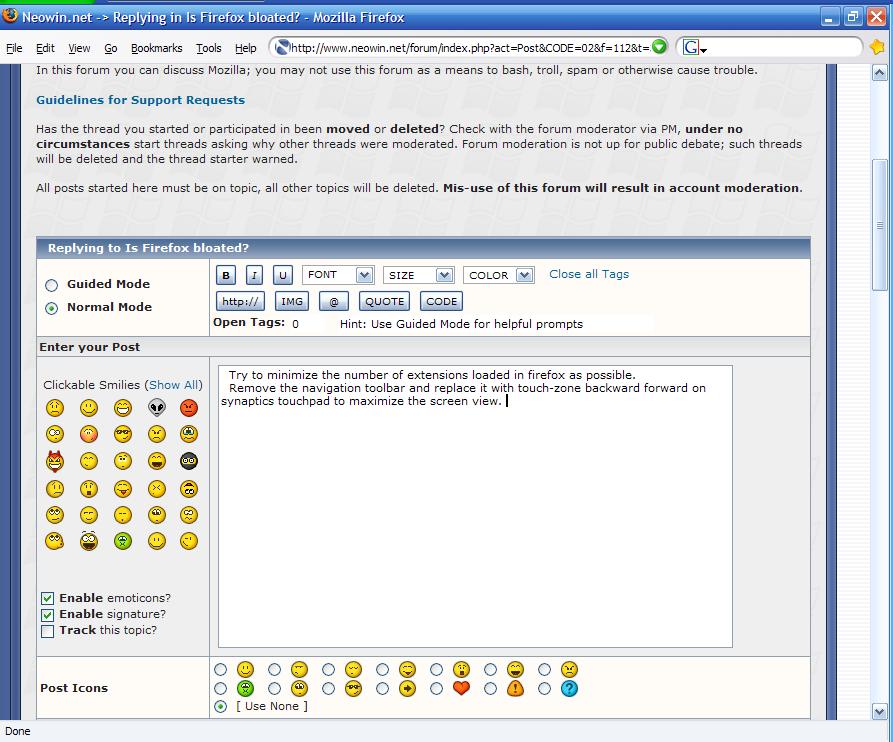 XIII Posted August 27, 2005 Share Posted August 27, 2005 Try to minimize the number of extensions loaded in firefox as possible. Remove the navigation toolbar and replace it with touch-zone backward forward on synaptics touchpad to maximize the screen view. Whether it is bloated or not depends on how you configure it. Link to comment Share on other sites More sharing options...