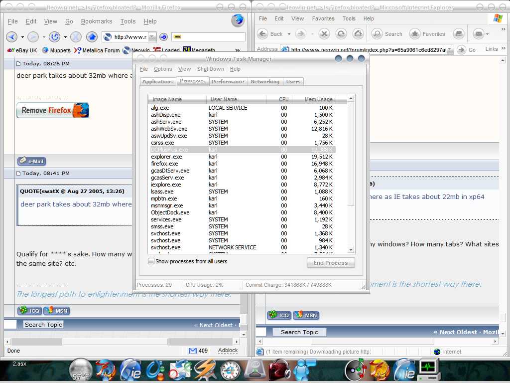 Denis W. Veteran Posted August 28, 2005 Veteran Share Posted August 28, 2005 Firefox is not bloated, it's a simple browser that does the job, perhaps is not as responsive as IE in some systems.It's not difficult at all to get a bloated IE6... just install msn bar :p But IE has always been a simple program too, but some other browsers have proven to be better nowadays. Opera is a bit bloated too, but the one I don't like AT ALL is maxthon (the good thing about it is that it has a lot of features). 586442871[/snapback] Since you mention Opera being bloated: I found this picture lying around in My Documents. Can't remember where I got it, but I (sort of) agree with this picture. Also read the 'comments'. They mirror most of these posts in this thread. Link to comment Share on other sites More sharing options...