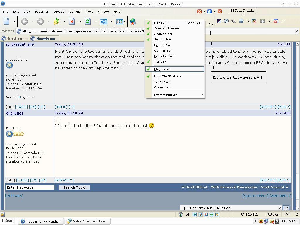 it_waaznt_me Posted September 8, 2005 Share Posted September 8, 2005 Right Click on the toolbar and click Unlock the Toolbar .. Make sure the Plugin Toolbar is enabled to show .. When you enable the Plugin toolbar to show on the mail toolbar, drag it so all of the enabled plugins are visible .. To work with BBCode plugin, you need to select a Textbox .. Such as this QuickReply box and click on the BBCode plugin .. All the common BBCode tasks will be added to the Add Reply text box .. Link to comment Share on other sites More sharing options...