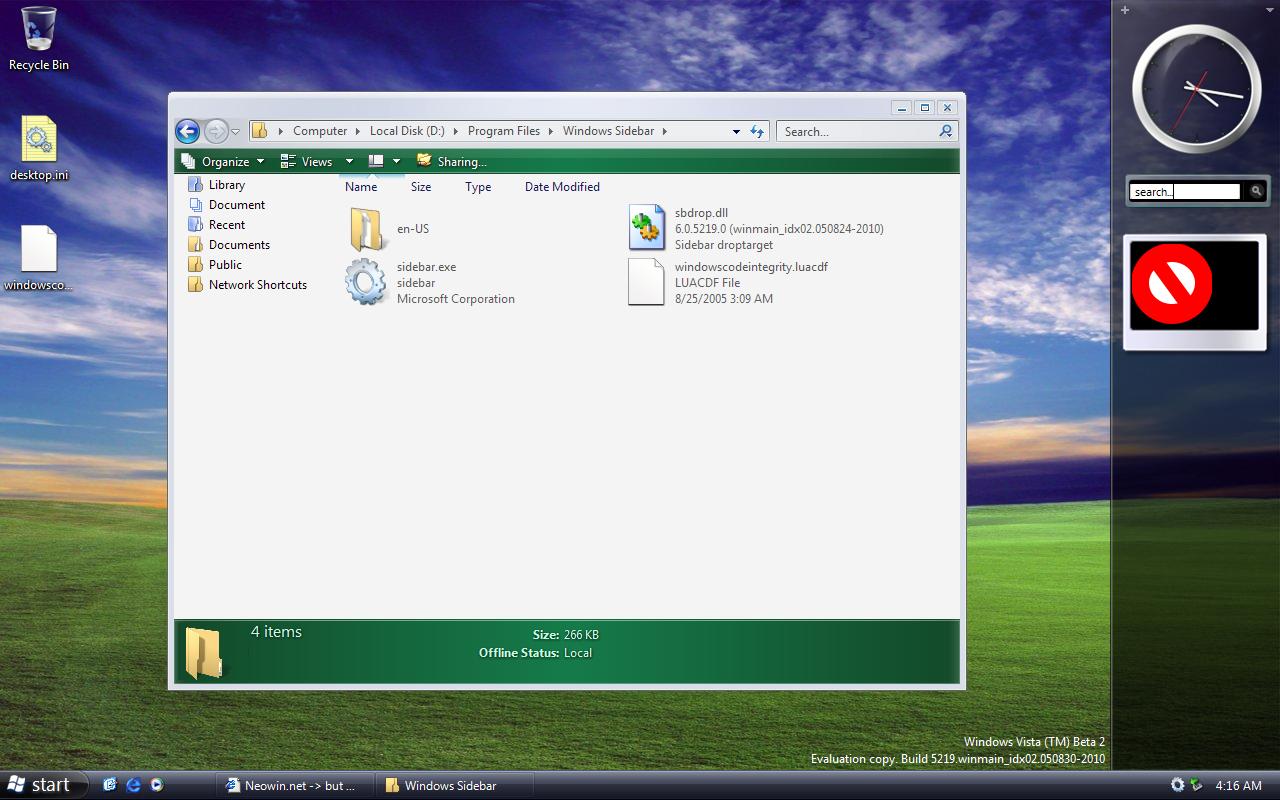 NemesisNG Posted September 17, 2005 Share Posted September 17, 2005 (edited) <omgomgomgomgomgomgomgomgomgomgomg>C:\Program Files\Windows Sidebar\sidebar.exe </omgomgomgomgomgomgomgomgomgomgomg> 586538629[/snapback] Thats the loaction in the 050824 version of 5219 of the actual sidebar app. My understanding is that someone has coppied that directory from the earler build and just ran it on the later build of 5219. Nothing trickey about it but you just need the files from 050824. If there is another way of making it work then great, but I think it's those files you need tho otherwise it ain't going to work. EDIT: Found the pic I saw of this... Nick Edited September 17, 2005 by NemesisNG Link to comment Share on other sites More sharing options...