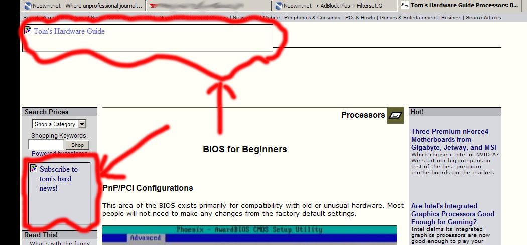 tareqsiraj Posted September 24, 2005 Author Share Posted September 24, 2005 Do you mean whitelist the whole site, including the ads? If so you can ad @@tomshardware.com But that will allow the ads to come through too.I wonder something though what other then the logo are you not able to see? 586574331[/snapback] nothing very important other than the logo... look at the attached picture. I also see broken image link like them in yahoo mail too. It just looks bad. Is there any way i can hide them? and for Toms Hardware... is there any way to ignore the image and show it? Thanks for your time. Link to comment Share on other sites More sharing options...