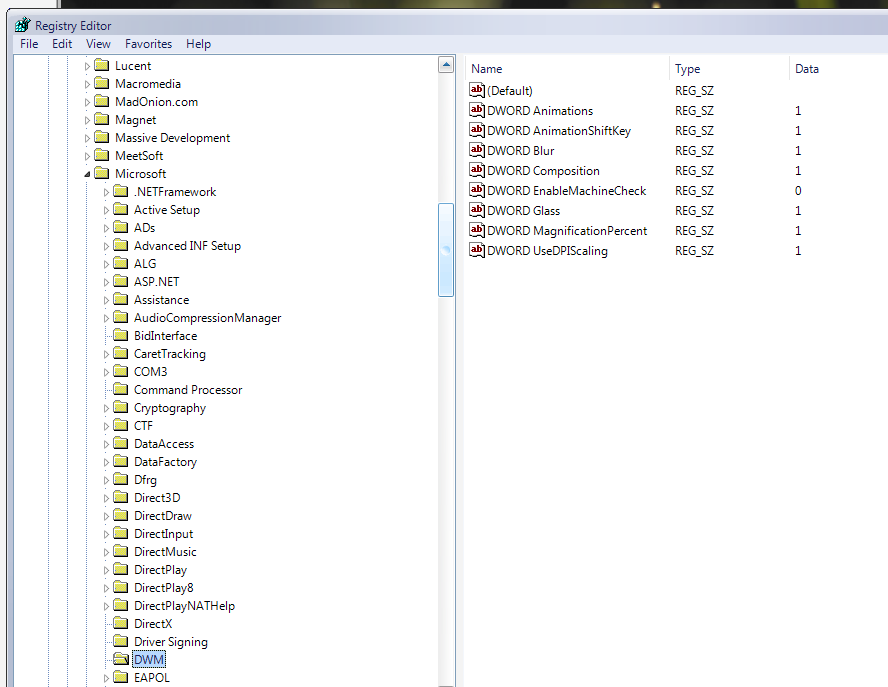 TheWahbinator Posted September 26, 2005 Share Posted September 26, 2005 Dude, your keys are all wrong. Delete the entire HKEY_LOCAL_MACHINE\Software\Microsoft\DWM. Yes, the whole folder. You add DWORDS, not just tack on the word "DWORD" to the beginning. Windows Registry Editor Version 5.00 [HKEY_LOCAL_MACHINE\SOFTWARE\Microsoft\DWM] "EnableMachineCheck"=dword:00000000 That's all you need, you can manually add a DWORD (NOT STRING) and set it to 1. Link to comment Share on other sites More sharing options...