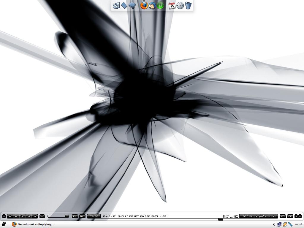 EGM92 Posted April 2, 2006 Share Posted April 2, 2006 I'm really liking my desktop this month. Wallpaper: Random Wall I found on the net :s VS: Athens DWM by MaStErHaCk Winamp skin: ClearOne Icons: Mix of Elements Suite & CHUMS win & some random icons. Programs: Rainlendar (default skin just blurred out my list), Objectdock Freeware, WindowBlinds 5, AveDesk 1.3 Clean: Dirty: Link to comment Share on other sites More sharing options...