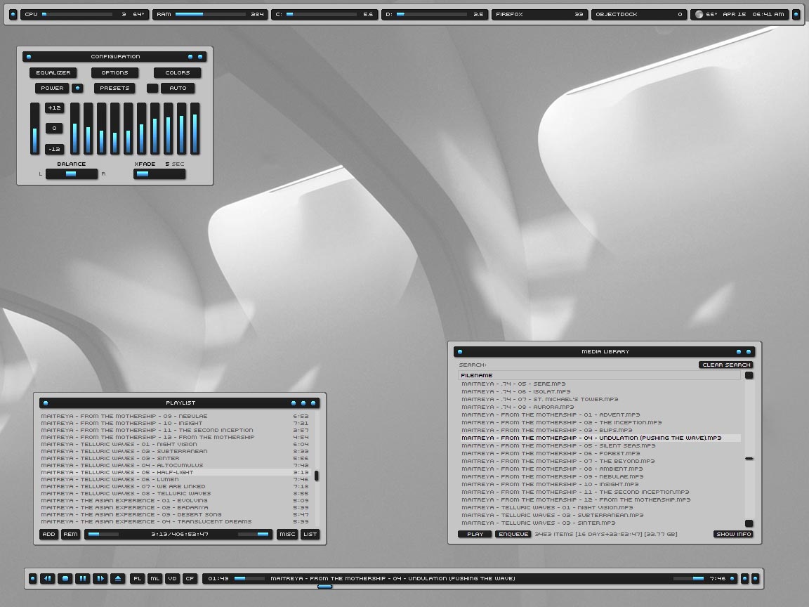 axialix Posted April 15, 2006 Author Share Posted April 15, 2006 Nice and minimal look you got going on there Hawk. Here's mine. The playlist and media library should be easy to add to a full-screen mode, but I can foresee many problems with adding the coverart. I'll have to check out leechbite's Kameleon skin for that. I believe he has it incorporated, though I don't know at what size. And hey, no need to thank me, this is what I live for. :) Link to comment Share on other sites More sharing options...