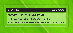 axialix Posted April 20, 2006 Author Share Posted April 20, 2006 How do you switch from the main window showing the volume bar to one that doesnt have it? The preview for Simplicity [solid] has one and the preview for Simplicity Clear doesn't. Where is the option for that? Right-click the cover art in the main window and choose "Default". Then maybe a 40% opacity rectangle right behind the text would do it... White if the text is black, black if the text is white... Here's what that looks like added to the notifier. Is this what you mean? If not, please give me a screenshot so I can better understand what you're getting at. Link to comment Share on other sites More sharing options...
