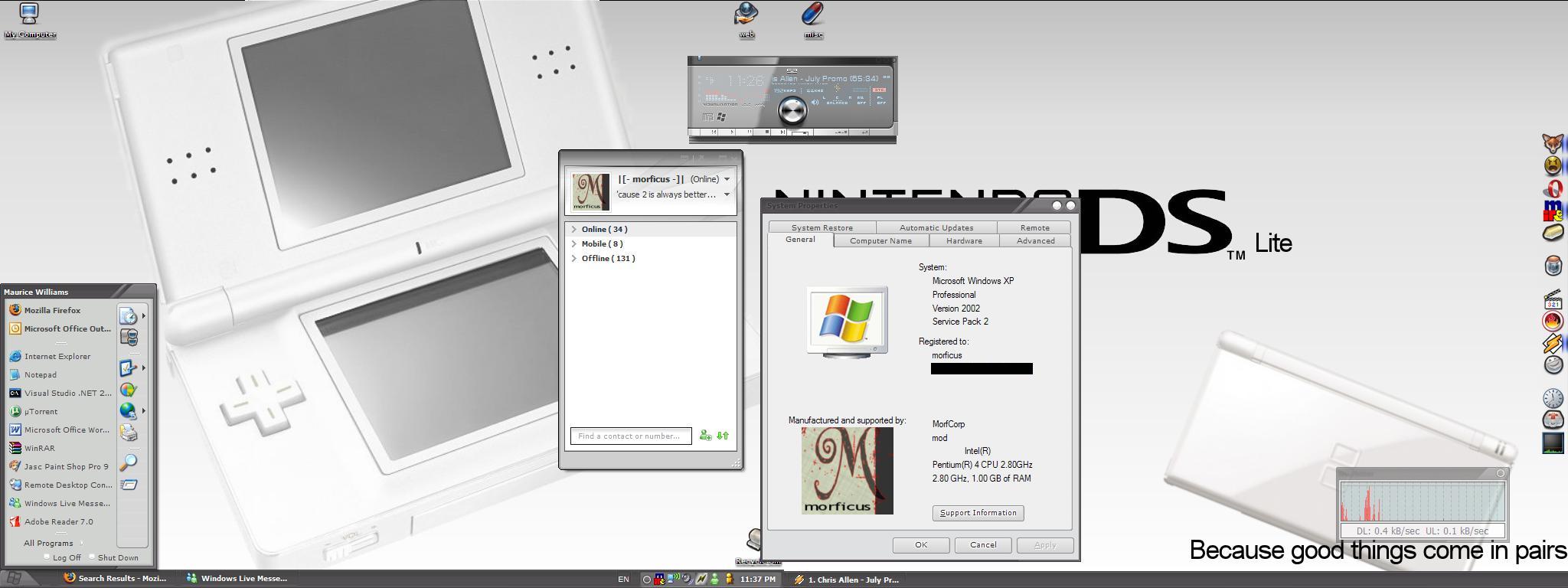 morficus Posted July 11, 2006 Share Posted July 11, 2006 Here's mine... nothing fancy... - Wallpaper: Nintendo DS Lite tribute (by me - I hope Nintendo does no suw my a$$ ;)) - Windows Theme: Life Ends (compact) - WinAmp Ski: S2 - High End - Live! Messenger: moded with MESS patch - Icons: most from the various GATNS sets - morficus ----[ dirty ]--------------------------------------- ----[ clean ]--------------------------------------- Link to comment Share on other sites More sharing options...
