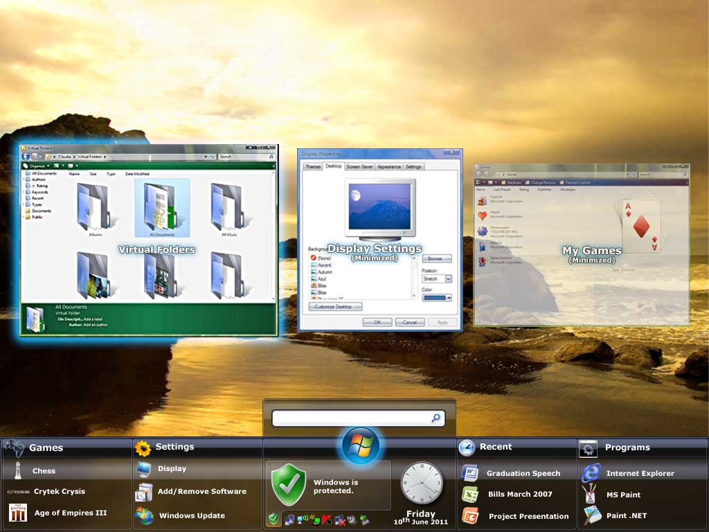 argonite Posted July 23, 2007 Share Posted July 23, 2007 (edited) I'd just like to contribute my idea which I have been sitting on for a while..When you create more instances of the same app or whatever, the app would gain a 3d attribute, ie with 4 instances, it would become a cuboid, which then in a fairly beryl-esque way I guess, you could then quickly flip through the shape with a keyboard command/ mousewheel/ iphone style touch and flick etc and the cuboid would rotate onscreen showing each window. That would mean the taskbar would change to the app bar. Where when you mouse over you get a preview of the open instances of the app, where you can quickly just get to the instance you want. I don't really have the photoshop skillz, but if anyone thinks this is a good idea, please can you make a mockup! :laugh: Paint.NET ROCKS!!!! The taskbar (bottom) looks a bit freaky because it was done in 3 minutes. The 'depressed' button, the one that's a bit elevated than the rest (in this case, Microsoft Word 2010) represents what the currently in-focus window is, and it displays thumbnails of the application instances which you can scroll by hovering. Edited July 23, 2007 by billyea Link to comment Share on other sites More sharing options...