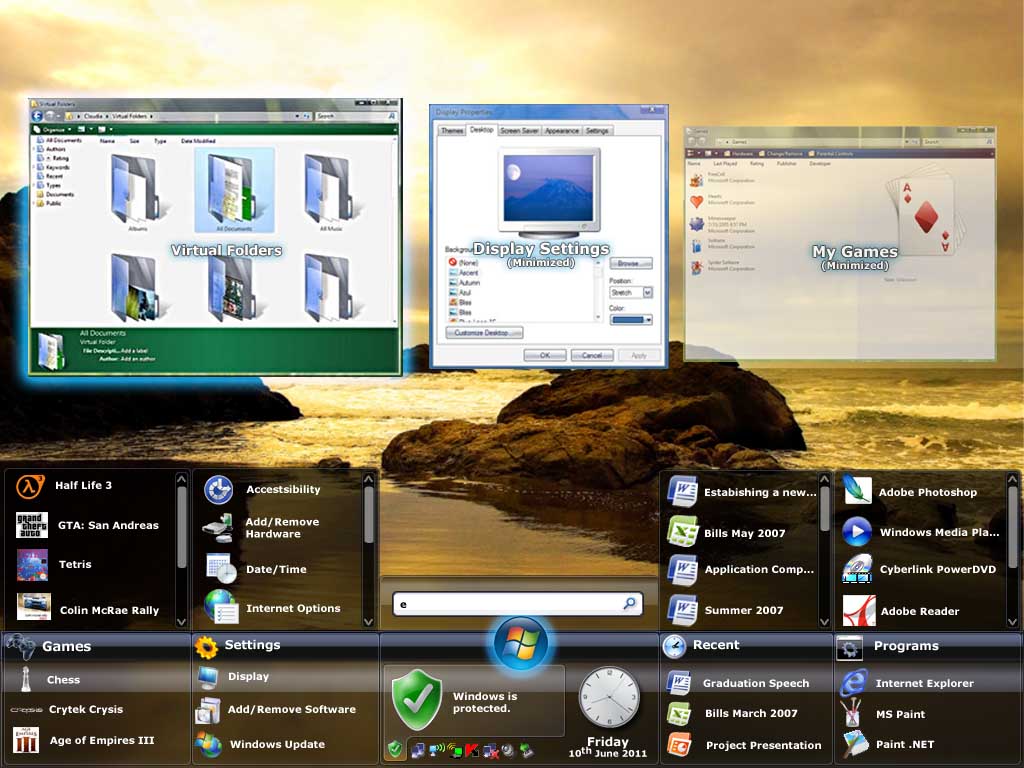 ADvert Posted June 22, 2007 Share Posted June 22, 2007 Hello, people. Here's my 3rd concept: Desktop You can see the old good taskbar at bottom and start button at left. At the top you see sidebar, now called Topbar. You can run your gadgets on it and you can dock your windows in it. This is something like more powerfull minimizing. Computer Devices are shown in some sorta of pie-menu. You can select device with your keyboard or with your mousewheel. Docked window Docked window is shown in topbar and always showing live preview of window. 3D windows You can rotate your windows in any direction. Just hit the CTRL key on your keyboard, grab a window and rotate it. The fun begins!!! :jump: :jump: Link to comment Share on other sites More sharing options...