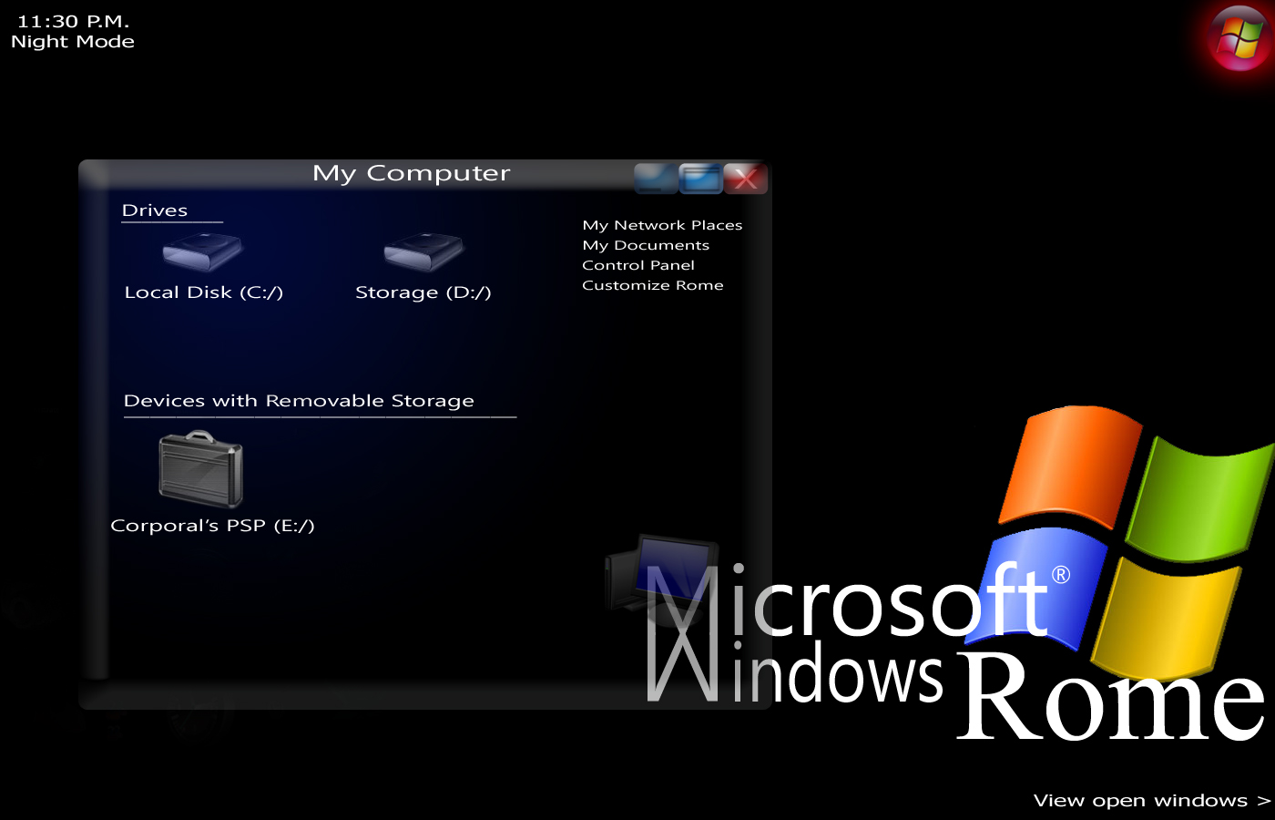 Corporal Punishment Posted October 19, 2008 Share Posted October 19, 2008 (edited) Well, here's my hand at it. Its still a work in progress. and I have a Daytime theme in the works too (also I noticed the view open windows instead of view minimized windows already. and its been already fixed.) Edited October 19, 2008 by Corporal Punishment Link to comment Share on other sites More sharing options...