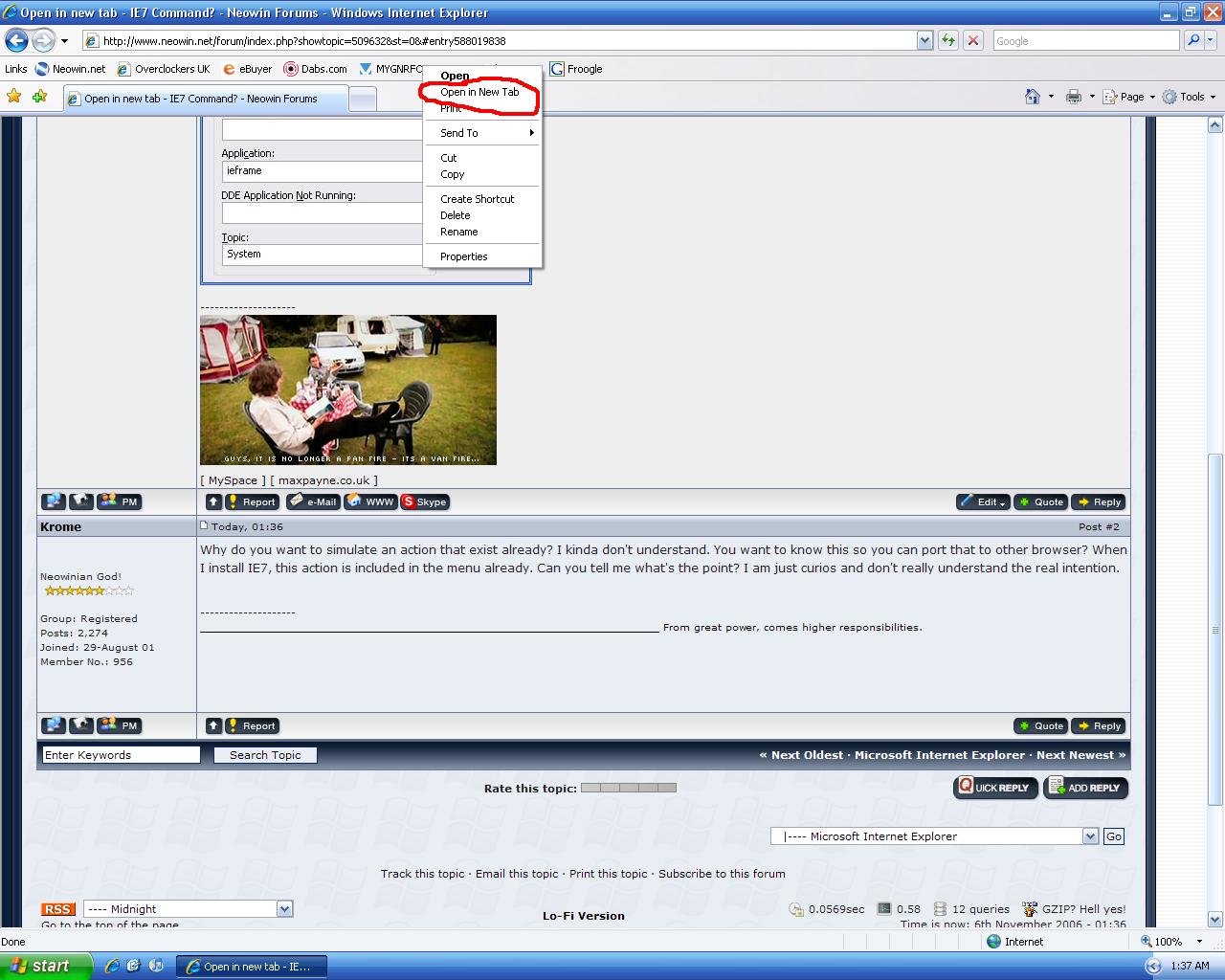 Max Veteran Posted November 6, 2006 Author Veteran Share Posted November 6, 2006 That (attached) was put there by me. I don't want to middle click. I want to right click and click something in a menu. Firefox does it - so why can't IE. Its a simple menu click - and I really want it there. It works - but just not properly. I was wondering whether there was a proper command for it. Link to comment Share on other sites More sharing options...