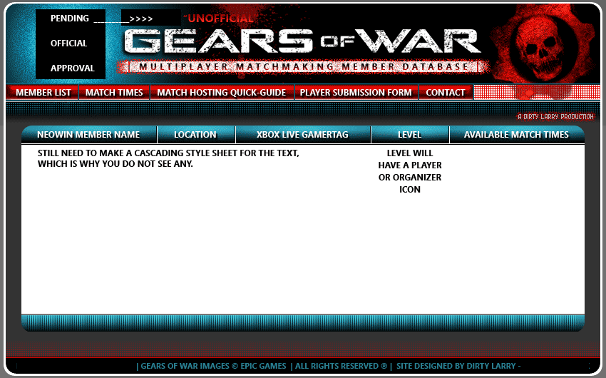 DirtyLarry Veteran Posted November 12, 2006 Author Veteran Share Posted November 12, 2006 This is a wonderful idea. I will try my best to play during the time/dates given. Now, if I can only get my GoW back from my friend.. Nice. (Y) Look forward to having you join when we get it started up. Also, I just wanted to show everyone the design I came up with really quick. As you can see most of the main design work is completed. Just text layout and what I refer to as some secondary graphic work needs to be done. As I was working on this design late Friday night, it sparked some memories for me of the work I had done on the members Neowin Unreal Tournament Clan website that although I was not a true participating member, I did the design for it about two or three years ago as I loved the game as well. What struck me as I was working on it is I fully believe it is no coincidence at all that the two games I made member website designs for and really wanted to make those designs, were both made by the same company, Epic. I have to hand it to them 110%. Those guys just truly know how to make amazing mutliplayer games. :yes: Enough reminiscing. ;) Here's the design. Link to comment Share on other sites More sharing options...