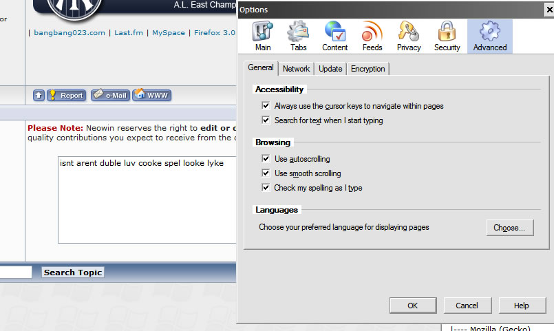 azz0r_wugg Posted November 18, 2006 Share Posted November 18, 2006 Where has the spell checker gone? It was there in the bon echo nightly builds - now it seems to have disapeared in the final! Is there any option to re-enable it? Also, maybe Im going nuts, but sometimes when I click a link I get sent back to the top of the page and the link isnt clicked, just selected, so I have to scroll back down and click it again. Just me? Link to comment Share on other sites More sharing options...
