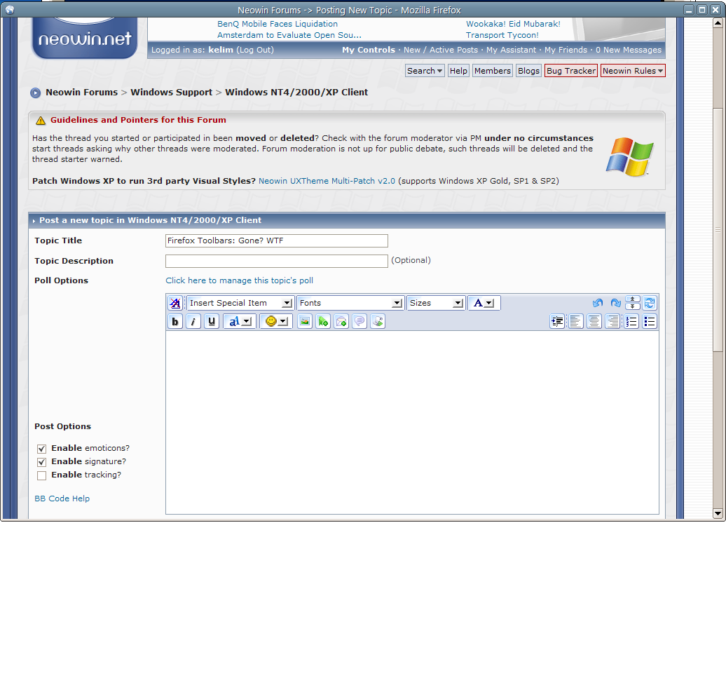 TokyoKiller Posted January 3, 2007 Share Posted January 3, 2007 Press ALT + V and you will get the "View" menu and under toolbars enable the tool bars. Also try to see if you're in fullscreen mode by pressing F11. Link to comment Share on other sites More sharing options...
