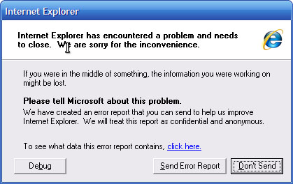 Maiku Posted February 3, 2007 Share Posted February 3, 2007 Hi all, I have an odd crash issue with IE7. I can use IE7 without any issues from browsing local html documents or testing ASP.NET sites from my local machine. But as soon as I try to connect to any site on the real Internet, the browser crashes after a few seconds. I have tried running it with the no addons option, but it does the same thing. I tried reinstalling (downgrade to IE6, which worked fine, then upgrade again to IE7), and still no change. I have made no modifications to my legal Windows XP Pro install (besides windows update, etc). Any ideas? This is really a bother, because I can't even get to Windows update! (Attached image is the crash dialog that I get). Link to comment Share on other sites More sharing options...