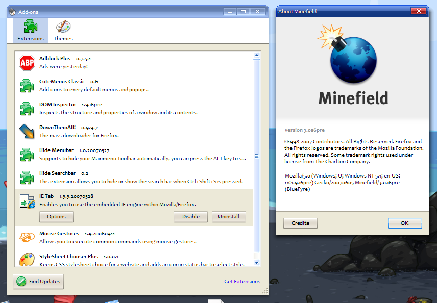 Zionyx Posted June 2, 2007 Share Posted June 2, 2007 Mozilla/5.0 (Windows; U; Windows NT 5.1; en-US; rv:1.9a6pre) Gecko/20070602 Minefield/3.0a6pre a6... just updated then. Can't see much of a difference, except that it forcibly disabled all my extensions - its never done that before. The alpha's have gotten much more stable recently, still a long way to go before its anywhere near even beta quality though... This has been a weird build. It crashes 3 times in a minute, the next time its all stable and my add-ons are magically back. Link to comment Share on other sites More sharing options...