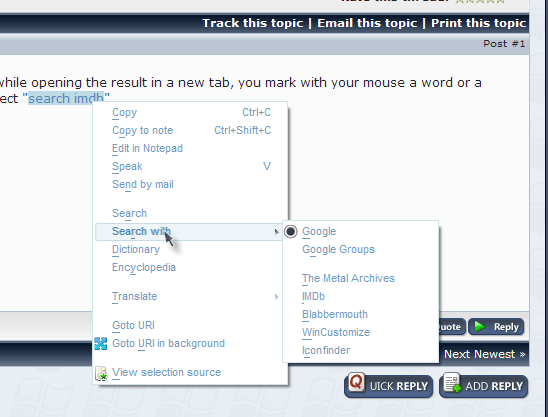 Shasoosh Posted May 7, 2007 Share Posted May 7, 2007 there's a firefox extension called "Imdb search 1.0" a very simple one too, all it does is to search the title in imdb while opening the result in a new tab, you mark with your mouse a word or a sentence then you click on it with the right click button and select "search imdb". any way it can be imported to opera? Link to comment Share on other sites More sharing options...