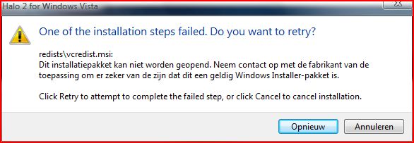 3lit3 Posted June 9, 2007 Share Posted June 9, 2007 Hello, I too have a problem with installing Halo 2 for Vista. When I click to install (or to start now) I get an error message: One of the installation steps failed. Do you want to retry?redist\vcredist.msi: This installation pack can't be opened. Contact the company of this aplication to ensure this is a this is a legal Windows installer-pack. When I try to execute this file manually in the map "redist", it sais this is not a legal installer pack :wacko:. What can I do to solve this? Link to comment Share on other sites More sharing options...