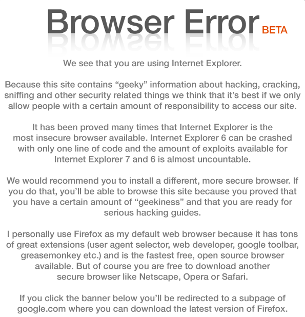 Ironman273 Posted August 11, 2007 Author Share Posted August 11, 2007 Firefox was the first browser that I used that actually had me stick with it. I had tried the other IE-type ones, Opera, Netscape, etc. but I liked using Firefox. When IE7 came out I actually stuck with it since it did what I needed out of a browser and didn't balloon the memory usage. I'm interested in seeing what Firefox 3 will have to offer, since 1 was such an improvement over IE6. Kind of off-topic, pages like this make me laugh and not come back to sites that use it: I was just looking for information on the OSx86 project when I got the error. I didn't need the information that bad. Link to comment Share on other sites More sharing options...