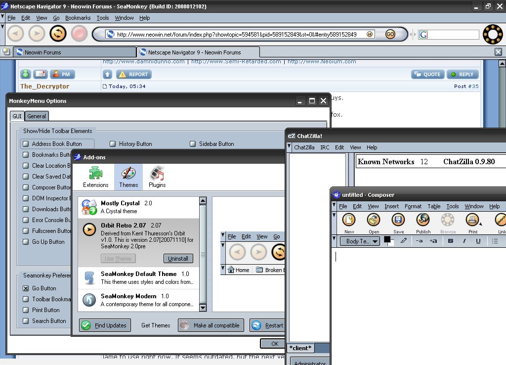 BinaryFragger Posted January 22, 2008 Share Posted January 22, 2008 yeah, but its a name with meaning! ha or used to be.Firefox for some reason doesn't really feel like netscape to me. if you remember, netscape used to come with a compose, irc, email client and more built in. I guess they called that the Mozilla Suite? (netscape 4.7 and 9:P) To me only SeaMonkey has the netscape feel to it, since it has the original them and everything, but that program is so lame to use right now. It seems outdated, but the next version i think SeaMonkey 2, should be much better and actually usable. They have some extensions for it, but its so complicated to use. The next version should have the addon/theme manager like firefox and everything so it'll be cool. And hopefully they'll put "x" on the tabs to close them. http://www.seamonkey-project.org/ SeaMonkey 2.0 is coming along nicely. The Firefox-style addon/theme manager is complete, and they're presently recoding the Preferences panel. The tabs don't have an "X," though, and I don't know if they ever will. It should also inherit Firefox 3.0's memory improvements, since SeaMonkey 2.0 will use the same rendering engine (Gecko 1.9) as Firefox 3. The nightly build I'm using right now is downright snappy. My favourite SeaMonkey extension, compatible with 2.0 alpha, is MonkeyMenu. It allows you to completely customize the interface, including adding a Firefox-style search bar next to the address bar. Link to comment Share on other sites More sharing options...