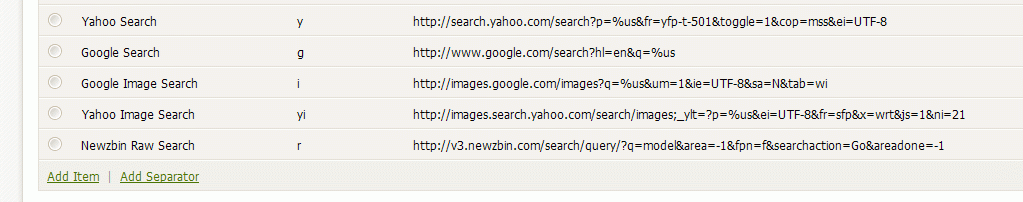dud Posted October 29, 2007 Share Posted October 29, 2007 In Maxthon, I can type a single letter in the address bar and it knows what search engine to use. For example, if I type: g pacific northwest = I get a google search for pacific northwest n crysis demo = I get a newzbin search for crysis demo i flowers = I get a google image search for flowers Is there something in Firefox that does this, or better yet, does Firefox have the ability already? Attached pic shows more detail. Link to comment Share on other sites More sharing options...