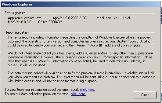 RadishTM Veteran Posted December 8, 2007 Veteran Share Posted December 8, 2007 Err, you have malware according to that .DLL that caused the crash. http://www.prevx.com/filenames/75507957403...B1111P.DLL.html Radish? Link to comment Share on other sites More sharing options...