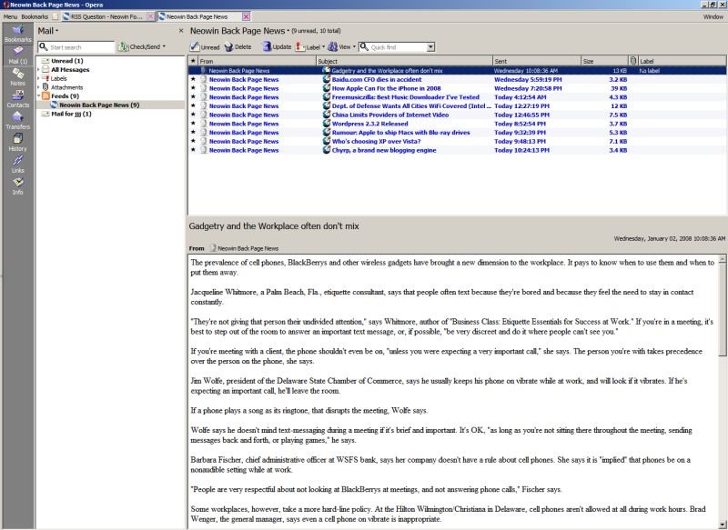 villiansv Posted January 3, 2008 Share Posted January 3, 2008 Hey everyone, I'm a Firefox user, but only because I love the RSS Menus in the bookmarks toolbar. However, I would much rather use Safari, Camino or Opera (Firefox looks bad on Mac OS X). However, I would love if there was some kind of plugin for these browsers that gave me RSS menus just like Firefox. Do you guys know of any? I can show you how an RSS feed looks like in Opera, just subscribed to the BPN on neowin quickly to take the screenshot. You cannot get the menu-like appearance in Opera (and I think you can't in Safari/Camino either, but I'm a windows user and can't say for sure). Link to comment Share on other sites More sharing options...