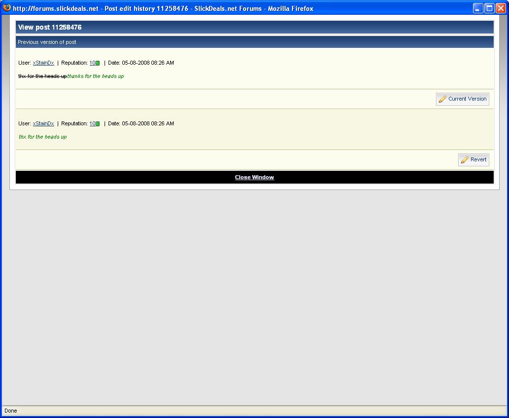 Steven Posted May 8, 2008 Share Posted May 8, 2008 (edited) Also because some people edit them to remove warn-worthy posts. ;) You could make an history viewable by moderators! and this whole time issue with 'bad posters' could be solved thus not having to inconvience us with a 30min rush to OMG fix that post fast!. I've seen it done on slickdeals.net Anything you edit still can be seen as they give you a nice Revisions button on all of your posts after you edit them. I wonder to this day with neowin and all it's super coder monkeys have yet to do this. Stuff that isn't time sensitive is a bit of a pain with the current system Edited May 8, 2008 by Steven Link to comment Share on other sites More sharing options...