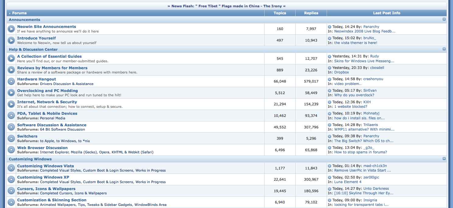 Steven P. Administrators Posted April 29, 2008 Administrators Share Posted April 29, 2008 I have just made a change to the forum index, and Rob has fixed the line height so it doesn't become too cluttered. Now the Forums display info on 2 lines rather than 3, which makes the whole forum index a bit shorter! Behold! This was suggested by Timan (vBulletin ######) and a few other people way back in December, and I only just got around to it after discussing it with staff at Neowindex. We have confirmed that everything still fits on smaller screen sizes. Link to comment Share on other sites More sharing options...