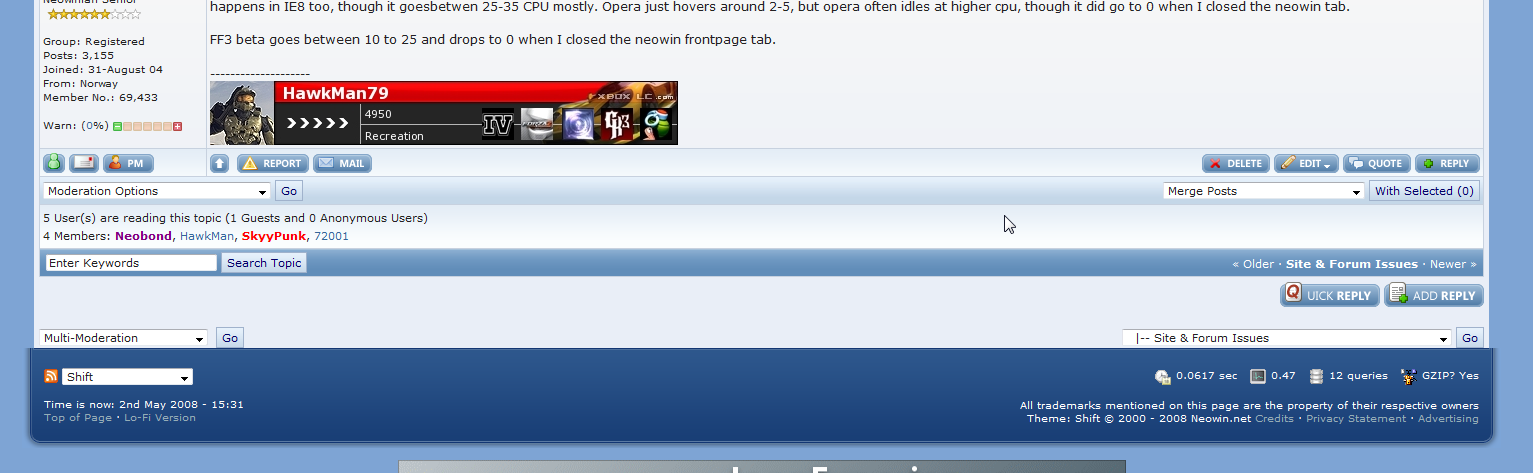 +Frank B. Subscriber² Posted May 2, 2008 Subscriber² Share Posted May 2, 2008 I've had this issue for a moment after the forum index change last night. Since then it's fine here. Browser: Mozilla/5.0 (Macintosh; U; Intel Mac OS X 10.5; en-US; rv:1.9pre) Gecko/2008050204 Minefield/3.0pre ID:2008050204 Link to comment Share on other sites More sharing options...