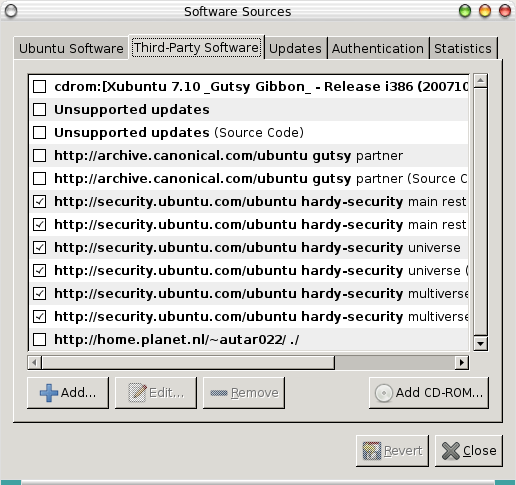 markwolfe Veteran Posted July 23, 2008 Veteran Share Posted July 23, 2008 ...As you might discovered i'm not the smarted regarding linux, so, just to make it totaly clear for me, "/etc/apt/sources.list" is where the repos are stored, right? ...so because some apps need do ad there lines (adresses). ... Or you can just open synaptic, and click Settings > Repositories then add them here: Link to comment Share on other sites More sharing options...