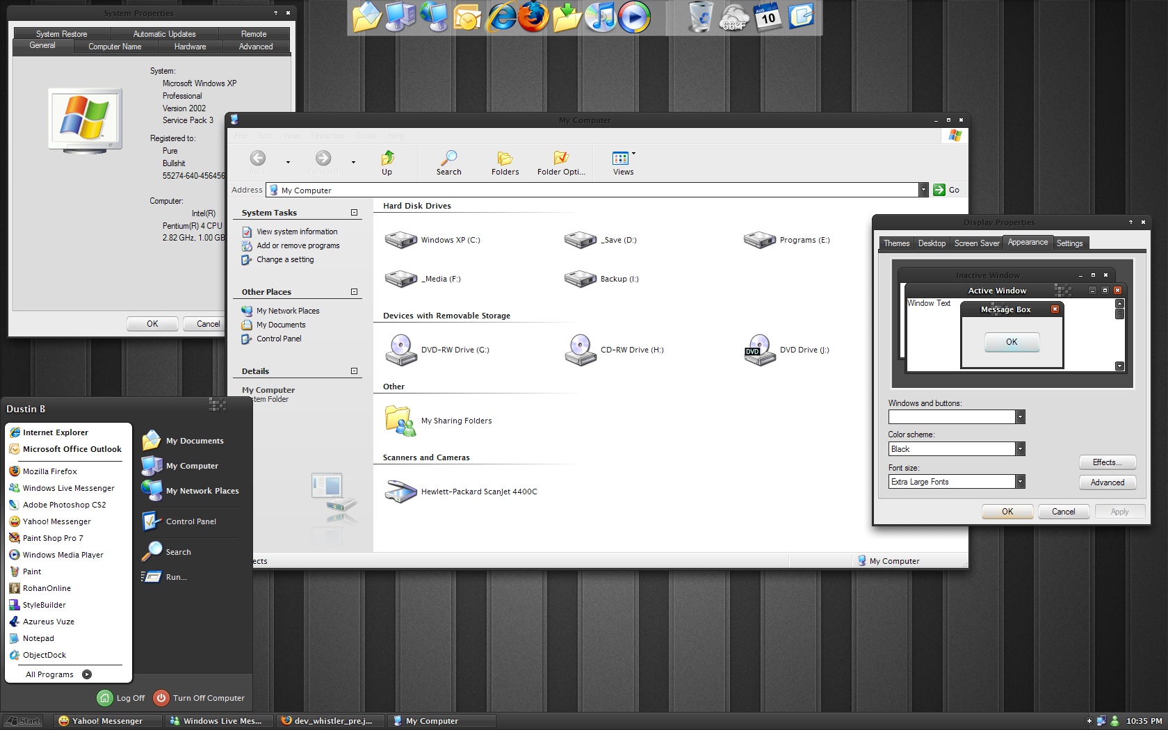 Dustin B. Posted August 13, 2008 Author Share Posted August 13, 2008 Black is nice, the other colors are decent. Good work sirBut it majorly f's up my firefox theme. All the tabs are in black and the text color is black, so can't read them :( nm, I see what you mean, looks like a Firefox bug. It's doesn't appear to be rendering the visual style correctly. Thanks for the black versionAlthough overall, I don't really like how you change the buttons, especially the "colors" when you roll-over on the buttons..make your professional design looks 'cheap' ^^ Just my opinion though, dunno about others It looks cheap because it is cheap, can't beat free :D Haha actually I designed new buttons because I felt the old ones were kind of bland looking. I thought the new ones added a nice touch, but I could be wrong :wacko: Link to comment Share on other sites More sharing options...