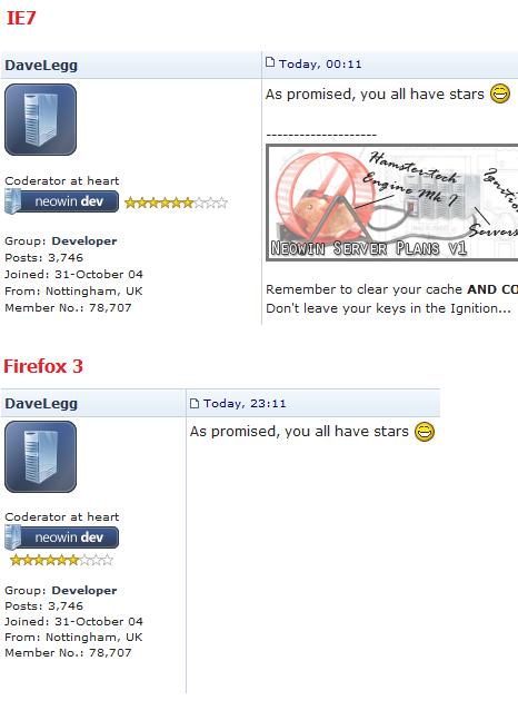 DaveLegg Developer Posted August 13, 2008 Developer Share Posted August 13, 2008 I must be the only person still using IE7 on Neowin as no one else has mentioned this :p, the stars don?t appear under the badge like they do in Firefox.Just giving you the heads up! Edit - the attachment failed and I can?t embed an image in this post for some reason but check the image here: http://upload.digiex.net/files/c919adbn3qbdnpqt78s0.jpg Fixed Link to comment Share on other sites More sharing options...