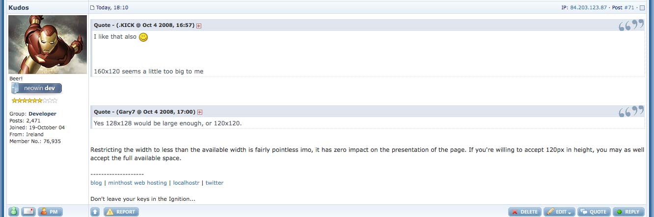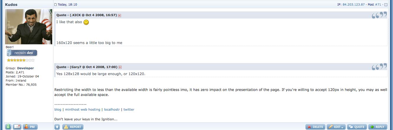 fr33k Posted October 5, 2008 Share Posted October 5, 2008 (edited) I added a highlighted selected area to show how it would impact the current forum standard. the green rectangle sizes are: 150x80 , 160x80 , 160x90 , 160x120 I liked 150x80, but the 160x80, and 160x90 look great. The 160x120 looks great too, but it might be too much of a change. the 16x9 avatar is probably the best. It's like your own wide screen movie without the black bars. 160x90 = 16:9ar <--- doesn't seem to push anything around. not as scary. 160x120 = 4:3ar <--- clearly intrudes down into the user title and pips area. for some OMG the sky is falling!!! Edited October 5, 2008 by fr33k Link to comment Share on other sites More sharing options...