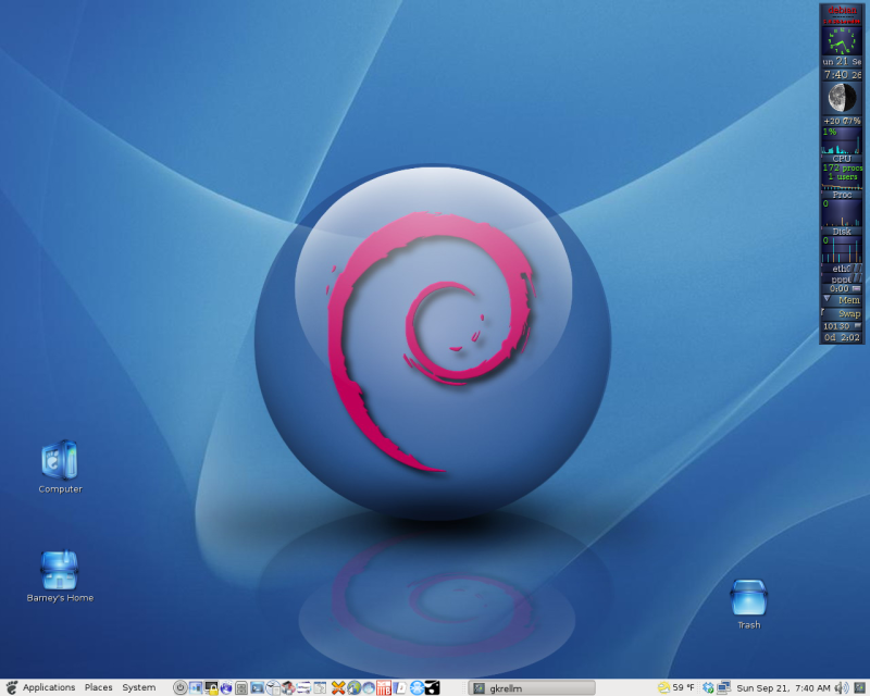 Barney T. Administrators Posted September 21, 2008 Author Administrators Share Posted September 21, 2008 Debian 4 Lenny x64 Glossy Glass Icon set Custom Debian Wallpaper Standard Net Install (if you haven't tried that, it rocks!) Link to comment Share on other sites More sharing options...