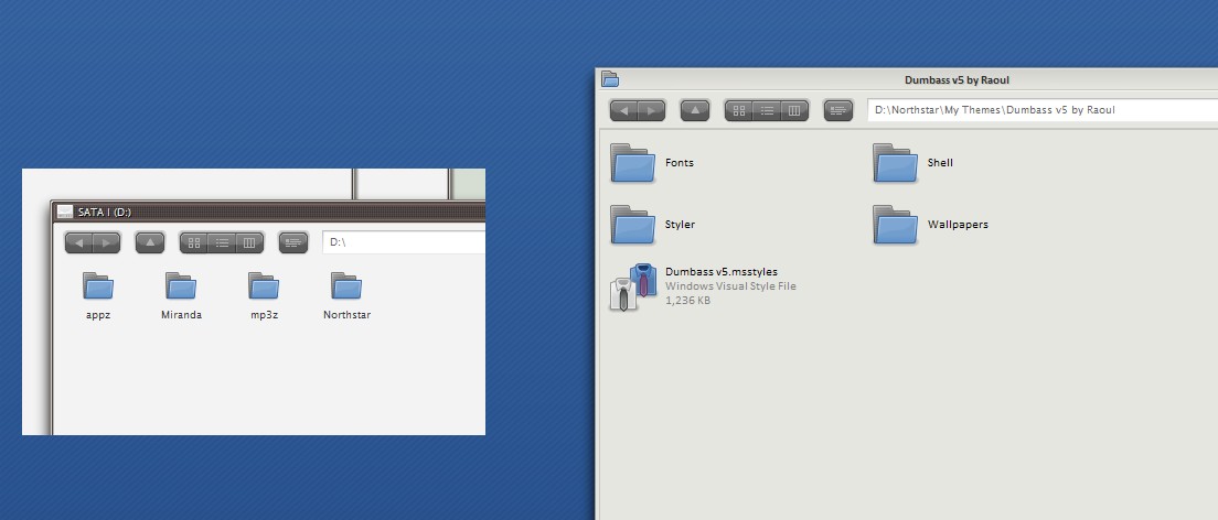 rec_kris Posted October 2, 2008 Share Posted October 2, 2008 Hello gang, I've recently started using styler which I'm loving so far. I've been using it paired with a theme called "Wobachi" I believe and love the way it gives my explorer windows a seamless appearance between the toolbars and the folder contents. I thought this was a Styler option, but the "seamless" effect goes away when I change visual styles. Does anyone know how to "fix" this? Or is it based on each visual style. If so, what element of the Vs needs to be changed? Thanks alot. (pic is smooth seamless on the left, not so on the right) Link to comment Share on other sites More sharing options...