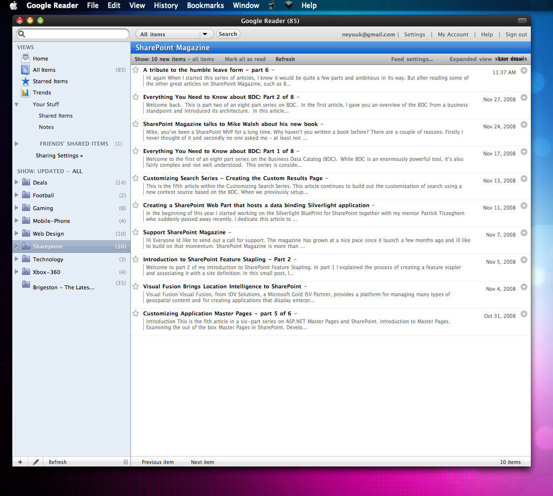 Steve Posted November 28, 2008 Share Posted November 28, 2008 Steve - what is the RSS icon in your dock with the unread badge? A real app, or a webapp? Thanks. It's Google Reader, but using Fluid app. I'm also using a new skin, which I acquired from errr... here. Here's a screenshot. Link to comment Share on other sites More sharing options...