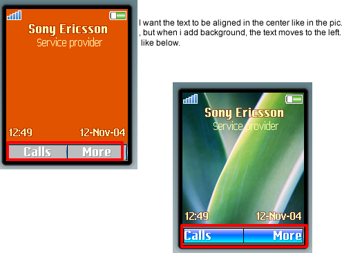 Soldiers33 Posted November 12, 2008 Share Posted November 12, 2008 Iam making a new theme for my phone, and have just noticed that the text on the softkeys are not aligned to the center. When I add a background the text automatically moves to the left, but if i remove the background the text goes back to the middle. Is it possible to change this? Link to comment Share on other sites More sharing options...