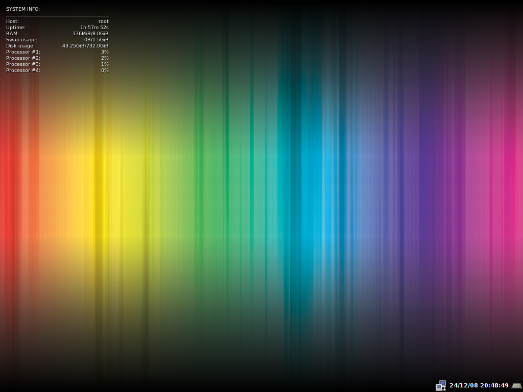 Behemoth Posted December 23, 2008 Share Posted December 23, 2008 OpenBox - Mint Theme - Loma Wallpaper - Stripes by arpbook Media Player - MOC Conky - tweaked from 15step's on DA Link to comment Share on other sites More sharing options...