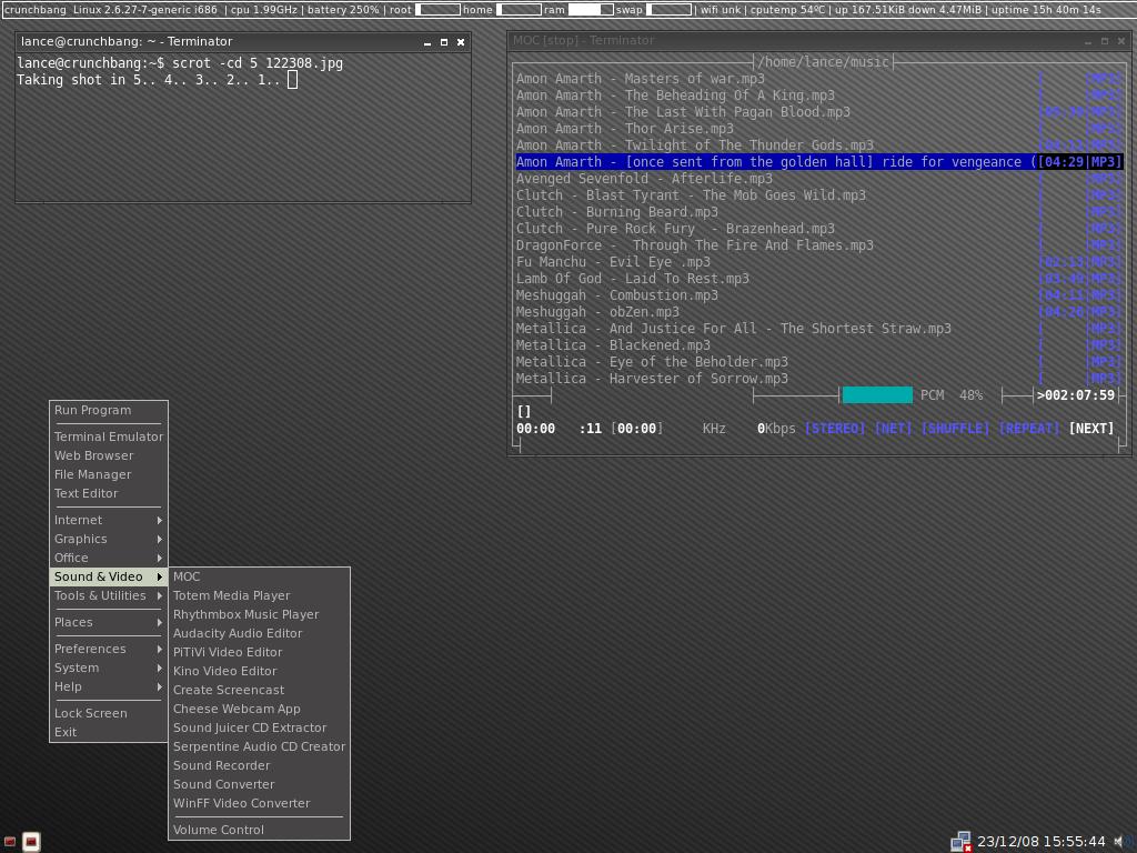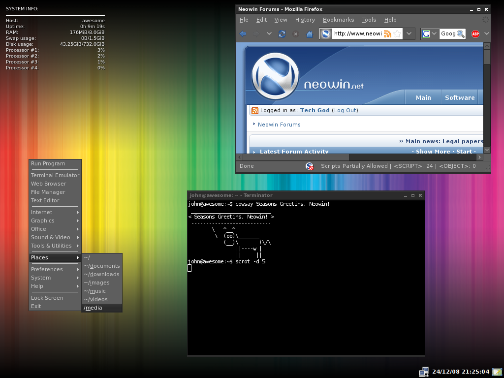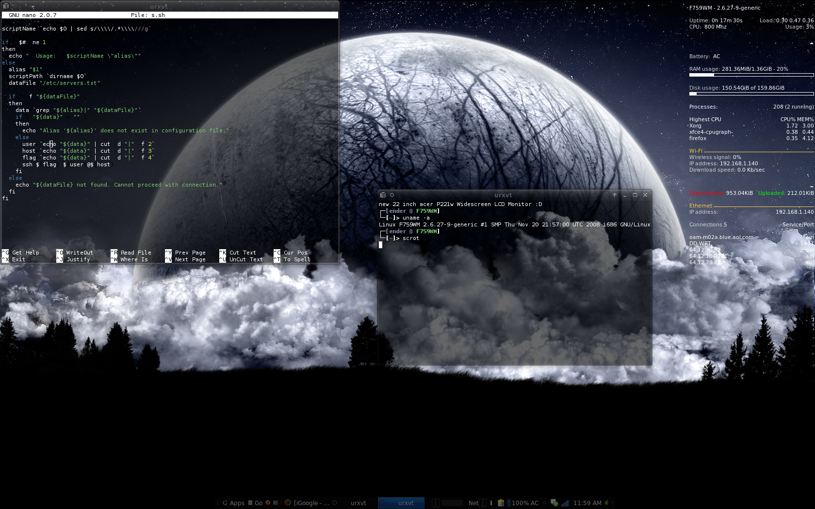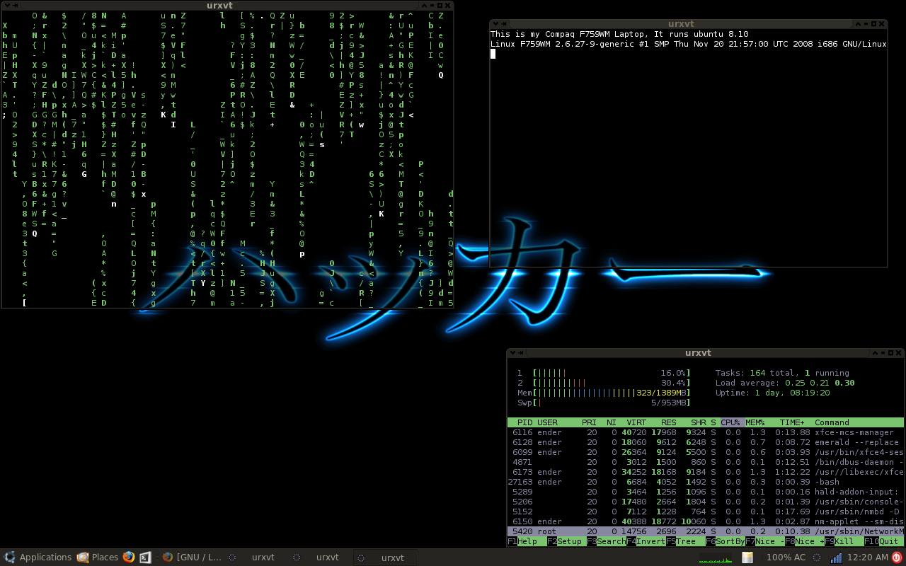 3nd3r Posted December 18, 2008 Share Posted December 18, 2008 This box is running Ubuntu 8.10 The WM is xfce4 You see firefox, urxvt, cmatrix, and htop. Link to comment Share on other sites More sharing options...